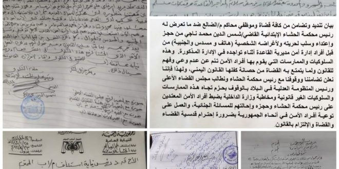 في غضون ذلك اصدر قضاة وموظفي المحاكم والنيابات بمحافظة الضالع بيان تنديد وإدانة استنكروا فيه ما تعرض له رئيس محكمـة الحشـاء الإبتدائية القاضي / شمس الدين محمـد نـاجـي مـن حجز وإعتداء وسلب لحريته ولأغراضه الشخصية ( هاتف و مسدس والجنبية ) من قبل أفراد إدارة أمن مديرية القاعدة أثناء تواجده في الإدارة المذكورة .