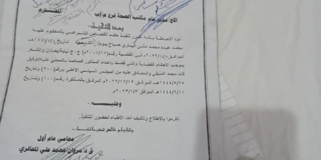 ناشدت قبائل ال المنيفي السيد القائد عبدالملك بدر الدين الحوثي ورئيس المجلس السياسي الأعلى المشير الركن مهدي المشاط بتنفيذ حكم القصاص الشرعي الصادر بحق المحكوم عليه/ محمد عبده مثنى اليباري والذي أقدم على قتل المجني عليه/ توفيق قائد محمد المنيفي وذلك بموجب الأحكام القضائية كما هو مبين وثابت في ملف القضية رقم (م 2008/ 17 ) والمصادق عليه من المجلس السياسي الأعلى برئاسة الرئيس مهدي المشاط برقم (200) وتاريخ ( 25/5/1444)هجرية