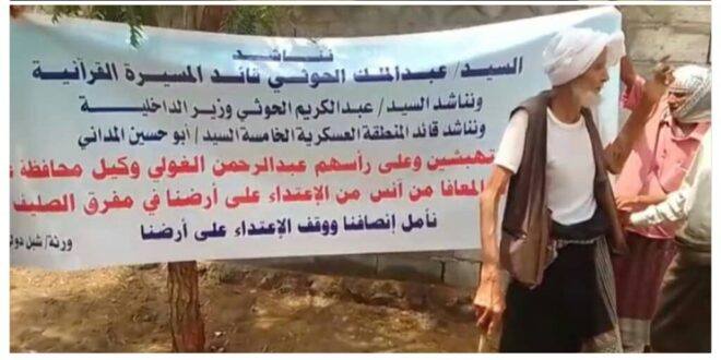 كما ناشدوا السيد محمد علي الحوثي وقائد المنطقة العسكرية الخامسة السيد ابو حسين المداني، وذلك بمنع وايقاف الاعتداء على أراضيهم الخاصة الواقعة في مفرق الصليف بمحافظة الحديدة.