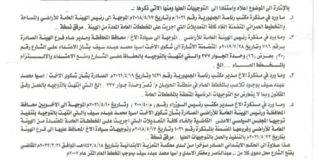 ونوهت إلى أنه كلما بدأت السلطة المحلية في محافظة تعز بالتحرك في اتجاه فتح مسار الشارع، تأتي مذكرة واتصالات من قبل مسؤول رفيع المستوى للضغط بإلغاء الشارع ومنعهم من فتح مساره في مخالفة لقانون التخطيط ولتوجيهات المجلس السياسي الأعلى التي أصدرها الرئيس الشهيد صالح الصماد وكذا للحكم القضائي الصادر من محكمة تعز الذي نص منطوقه على إلغاء التعديل وفتح مسار الشارع نافذاً وفقاً للمخطط العام المعتمد من الهيئة العامة للأراضي في العام 2003.