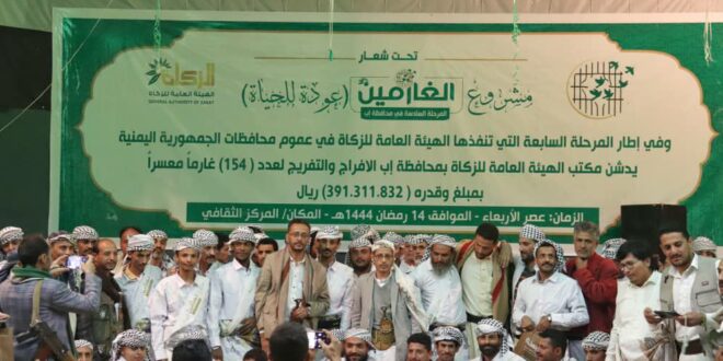 دشنت الهيئة العامة للزكاة بمحافظة إب اليوم المرحلة السادسة من مشروع الغارمين للعام 1444ھ تحت شعار “الغارمين عودة الحياة” ، الذي تنفذه الهيئة في مختلف المحافظات، لعدد ( 154) غارما ومعسرا، بمبلغ 391 مليون و311 ألف ريال.