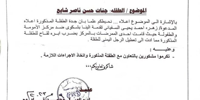حيث تقدمت جدة الطفلة جنات حسن ناصر شائع بشكوى إلى إدارة شرطة مديرية الخوخة ضد مركز الامومة والطفولة ، قالت فيه إن إحدى الممرضات بالمركز قامت بضرب إبرة لقاح للطفلة المذكورة ، مما ادت إلى تعطيل الرجل اليمنى .