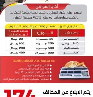 رحبت النقابة العامة للمخابز والافران بقرار وزارة الصناعة والتجارة بتحديد سعر الكيلو الجرام للخبز بكافة انواع بمبلغ 400 ريال وكذا تحديد حجم قرص الخبز الواحد بوزن 50 جرام .