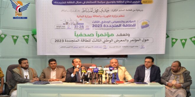 عقدت وزارتا الكهرباء والطاقة والمالية اليوم مؤتمراً صحفياً حول المؤتمر والمعرض الوطني الثالث للطاقة المتجددة 2023 الذي سيقام خلال الفترة 28 – 31 أكتوبر الجاري برعاية فخامة المشير الركن مهدي المشاط رئيس المجلس السياسي الأعلى.