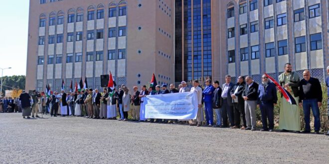 ورفع موظفو وزارة الصناعة والتجارة شعارات تؤكد على دعم ونصرة غزة والمقاومة الفلسطينية وتدعو لمقاطعة البضائع الامريكية والشركات الداعمة للكيان الصهيوني .