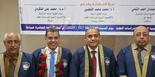 تكونت لجنة المناقشة والحكم من أ.د- محمد محمد القطيبي، أستاذ العلوم المالية في الأكاديمية اليمنية للدراسات العليا- مناقشا ورئيسا، وأ.م.د- محمد علي المكردي، أستاذ الاقتصاد المالي والمصرفي بجامعة ذمار، عميد كلية العلوم الإدارية جامعة الجيل الجديد- مشرفا، وأ.م.د- همدان احمد الشامي، أستاذ العلوم المالية المشارك في جامعة تعز.