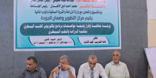 دشنت بجامعة الحديدة وبالتعاون والتنسيق مع وزارة الزراعة والثروة السمكية والموارد المائية وبرعاية اللواء / عبدالله عبده عطيفي محافظ المحافظة وحضور الأستاذ الدكتور / محمد أحمد الأهدل رئيس الجامعة اليوم ورشة مناقشة وإقرار مواصفات برنامج بكالوريوس الطب البيطري بكلية الزراعة والطب البيطري والتي سوف تستمر خلال الفترة 6/9 من الشهري الجاري بمجمع الآداب الجامعي الواقع بشارع فلسطين وسط المحافظة.