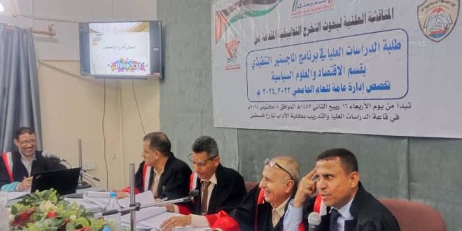 برعاية الأستاذ الدكتور / محمد أحمد الأهدل رئيس الجامعة ومتابعة الأستاذ الدكتور/ محمد حمد بلغيث نائب رئيس الجامعة للدراسات العليا والبحث العلمي، تستمر مناقشة بحوث التخرج التطبيقية لطلبة الدراسات العليا في برنامج الماجستير التنفيذي تخصص إدارة عامة قسم الاقتصاد والعلوم السياسية بكلية التجارة والاقتصاد.
