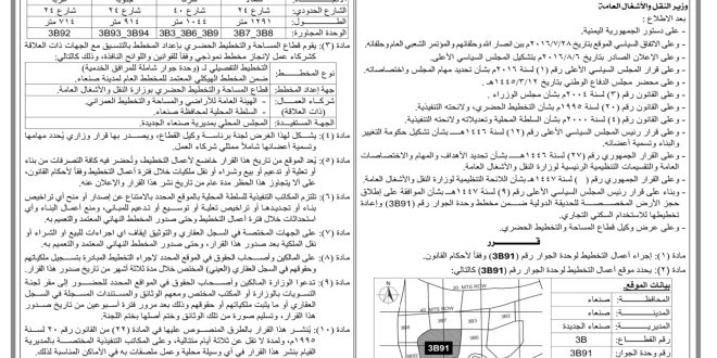 أعلنت وزارة النقل والأشغال العامة عن تدشين الخطوات التنفيذية لتخطيط وحدة الجوار رقم (3B91) الواقعة في منطقة أرتيل (سواد حنش)، بمديرية صنعاء الجديدة وذلك في إطار جهود الوزارة لتنظيم التوسع العمراني والحد من العشوائيات في محيط العاصمة.