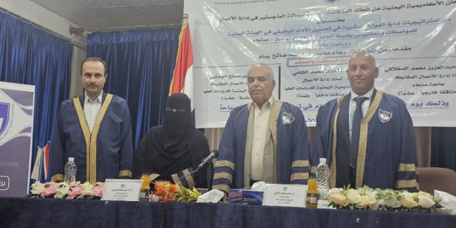 حصلت الباحثة رجاء محمد عبد الله صالح رسام على درجة الماجستير بتقدير امتياز من الأكاديمية اليمنية للدراسات العليا، عن رسالتها الموسومة بـ: “دور استراتيجيات إدارة الموارد البشرية في تحسين الأداء الوظيفي بالهيئة اليمنية للمواصفات والمقاييس وضبط الجودة بأمانة العاصمة”.
