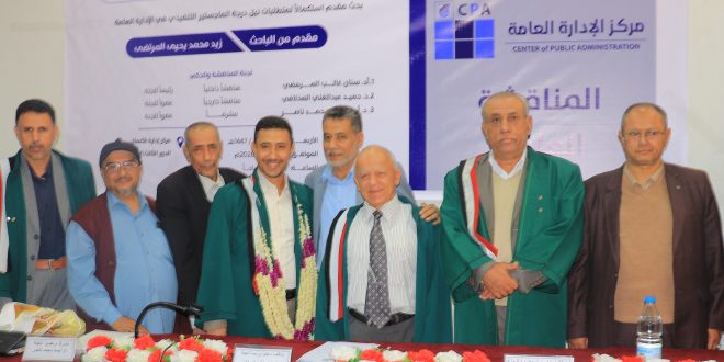شهد كلية التجارة والاقتصاد بجامعة صنعاء، اليوم الأربعاء، المناقشة العلنية لرسالة الماجستير التنفيذي في الإدارة العامة المقدمة من الباحث زيد محمد يحيى المرتضى، والموسومة بـ: