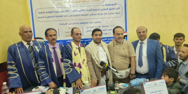 وأشادت لجنة المناقشة والحكم برئاسة الدكتور يوسف الرباعي وعضوية الدكتور منير المخلافي مناقشا خارجيا، و الدكتور وليد جعدان مناقشا داخليا، بمضمون ومنهجية الدراسة وبالنتائج التي توصل اليها الباحث في قياس تاثير تطبيق المعايير الدولية لإعداد التقارير المالية وبما يسهم في رفع مستوى جودة التقرير المالية في المنشآت اليمنية “.