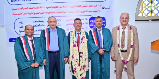 حصل الباحث مجدي علي الصماط، اليوم على درجة الدكتوراه بامتياز، من كلية الطب والعلوم الصحية بجامعة صنعاء – قسم علم الأدوية والمداواة، عن أطروحته الموسومة بـ” دور انزيم الجاما جلوتاميل ترانسبيبتيديز في السمية الكلوية المستحثة بالسيسبلاتين والسيكلوفوسفاميد في حيوانات التجارب المعملية”.